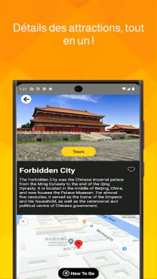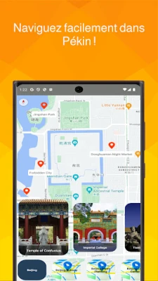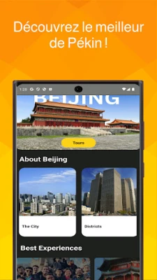 Avec Pékin Guide de Voyage, planifiez votre voyage idéal à Pékin gratuitement. Accédez à des itinéraires, réservez activités et visites, et explorez la Cité interdite ou la Grande Muraille avec des cartes, des transports publics et en 14 langues.