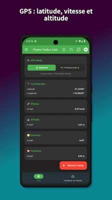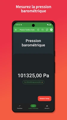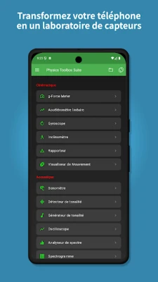 Explorez un spectre impressionnant de mesures à travers divers modules. En cinématique, suivez la force G, l'accélération linéaire, la vitesse angulaire et l'inclinaison avec une précision remarquable, même un rapporteur numérique est à portée de main. Le domaine de l'acoustique s'ouvre avec un sonomètre, un détecteur et générateur de tonalité, ainsi qu'un oscilloscope et un analyseur de spectre pour une étude sonore approfondie. Plongez dans la lumière et le magnétisme avec un luxmètre, un détecteur de couleurs, un stroboscope pour visualiser les phénomènes, une boussole, un magnétomètre et même une visualisation des vecteurs magnétiques en réalité augmentée via Magna-AR. Des fonctionnalités supplémentaires comme le baromètre, le GPS, la règle numérique et la température système complètent ce tableau déjà riche.