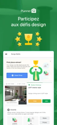 Planner 5D est plus qu'un simple outil ; c'est une source inépuisable d'inspiration et une communauté vibrante. Parcourez la vaste galerie de projets créés par d'autres utilisateurs pour stimuler votre imagination ou partagez vos propres chefs-d'œuvre. Participez aux stimulants "DUELS DE DÉCORATION" hebdomadaires, affrontez d'autres designers sur un thème donné et tentez de remporter des prix exclusifs. Que vous soyez un passionné d'aménagement intérieur ou un architecte d'intérieur chevronné, l'application est accessible en ligne comme hors ligne, et son interface conviviale, disponible en plusieurs langues, garantit une expérience fluide sur toutes vos plateformes grâce à la synchronisation de compte.